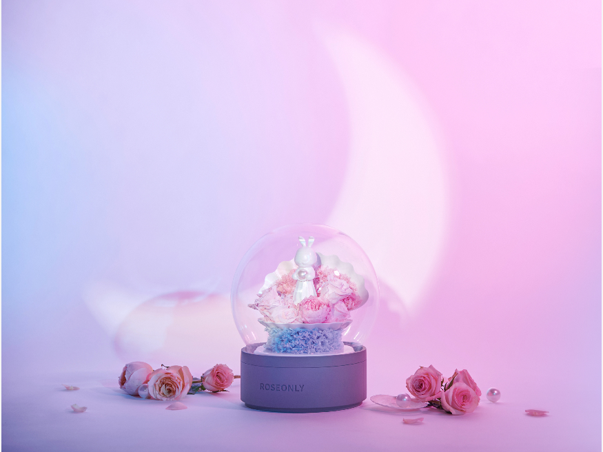 ROSEONLY让珠光萦绕的萌兔化身维纳斯,外形甜美娇憨的维纳斯兔,怀中拥抱璀璨夺目的珍珠,象征爱人如珠宝般的珍贵纯粹,置身于温柔恬静的粉色玫瑰之中,在呈现甜蜜气息与少女情怀的同时,透露一丝趣味及灵动,一朵玫瑰寓意“此爱只此唯一”的美好。不倒底座,诠释爱不止息,融合灵巧的球形设计,适合抱在手中观赏。